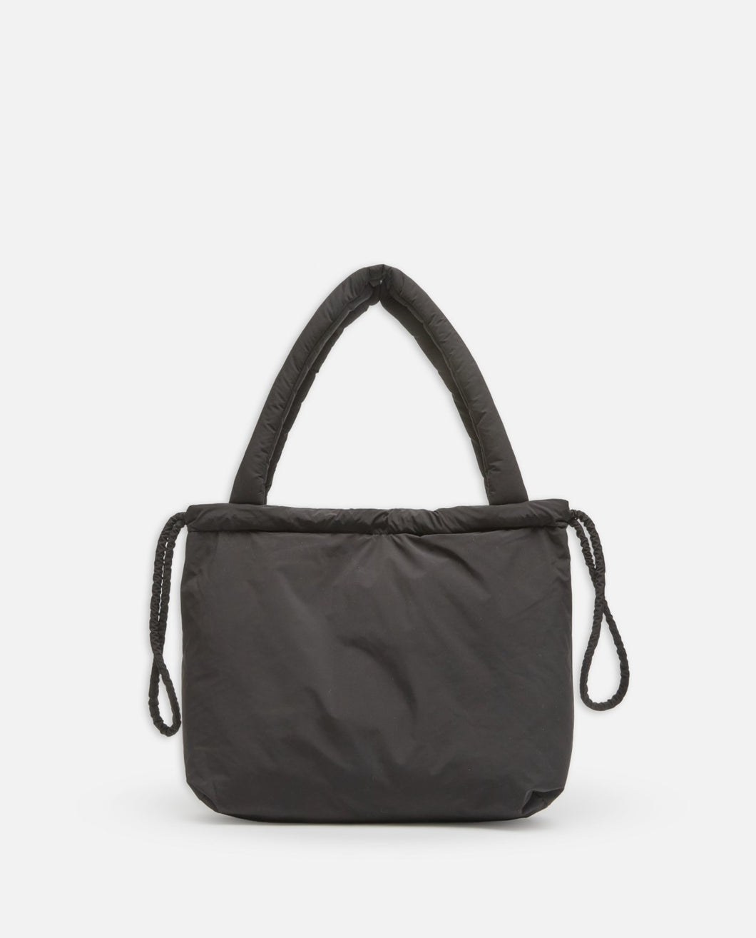 Quilted black bucket bag. Made of recycled fibres. With lining. 2 shoulder straps. Snap fastening and adjustable straps. Inside pocket.