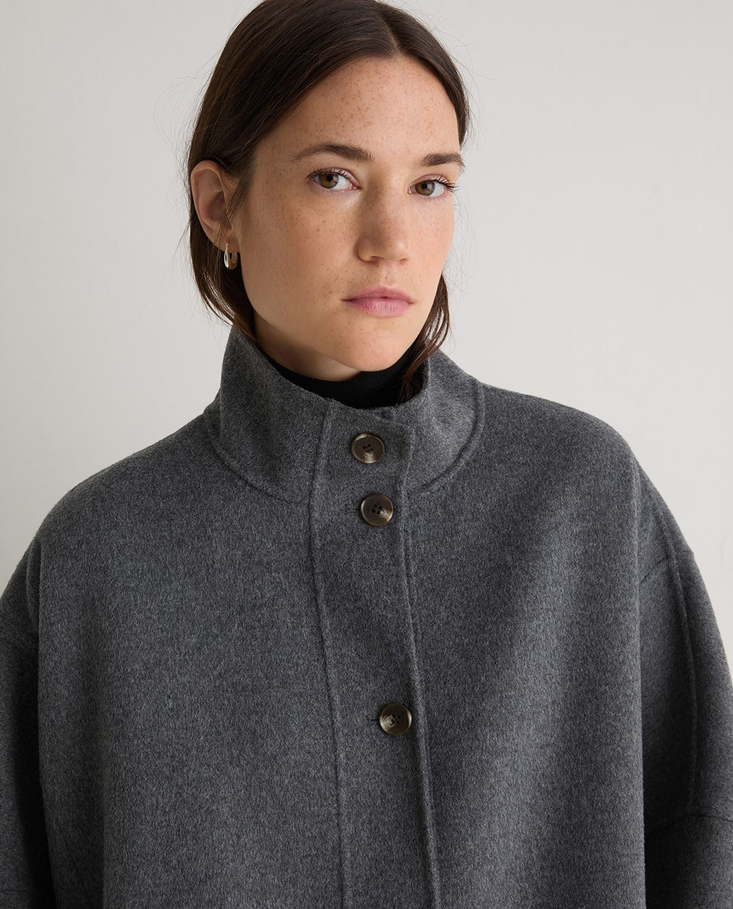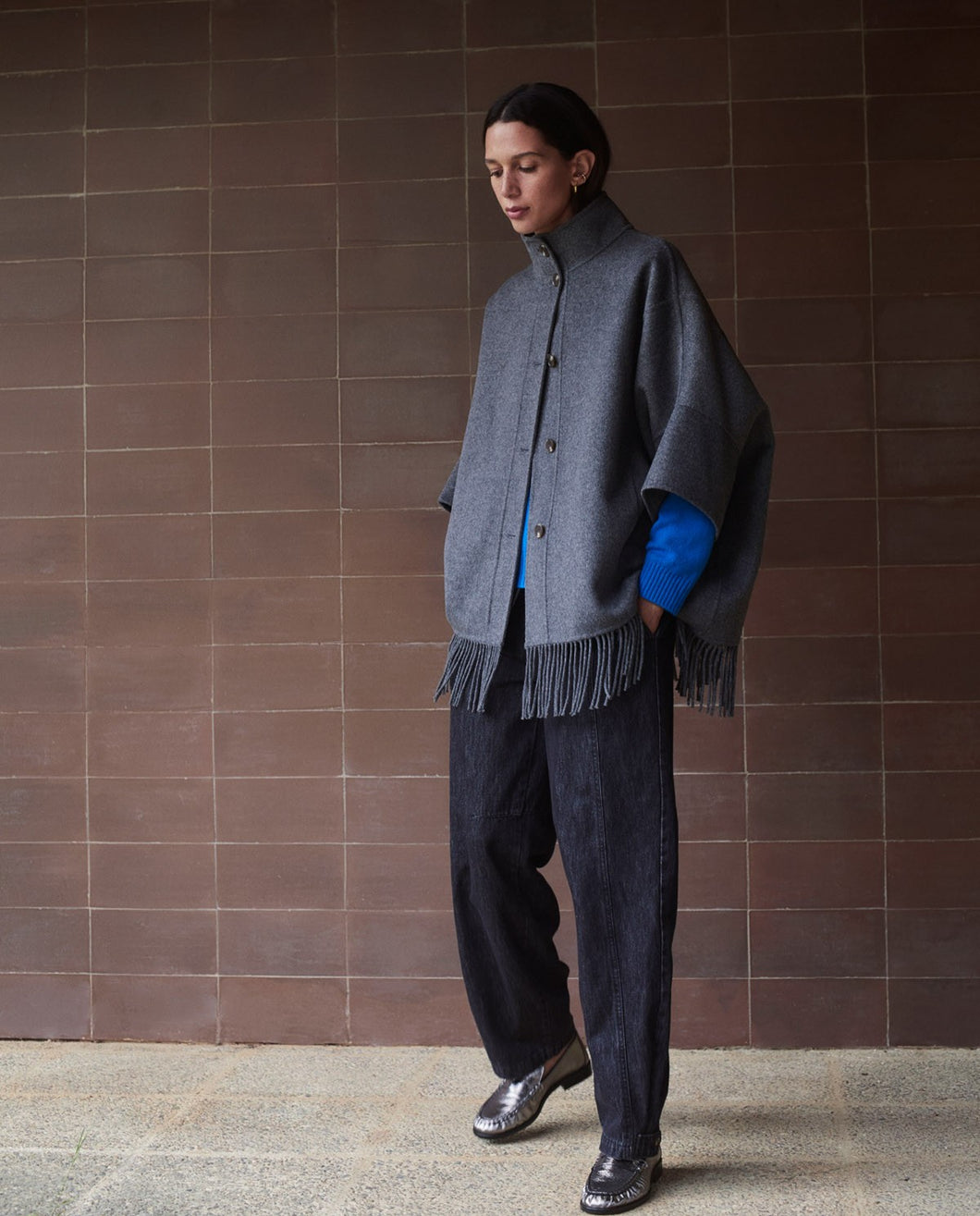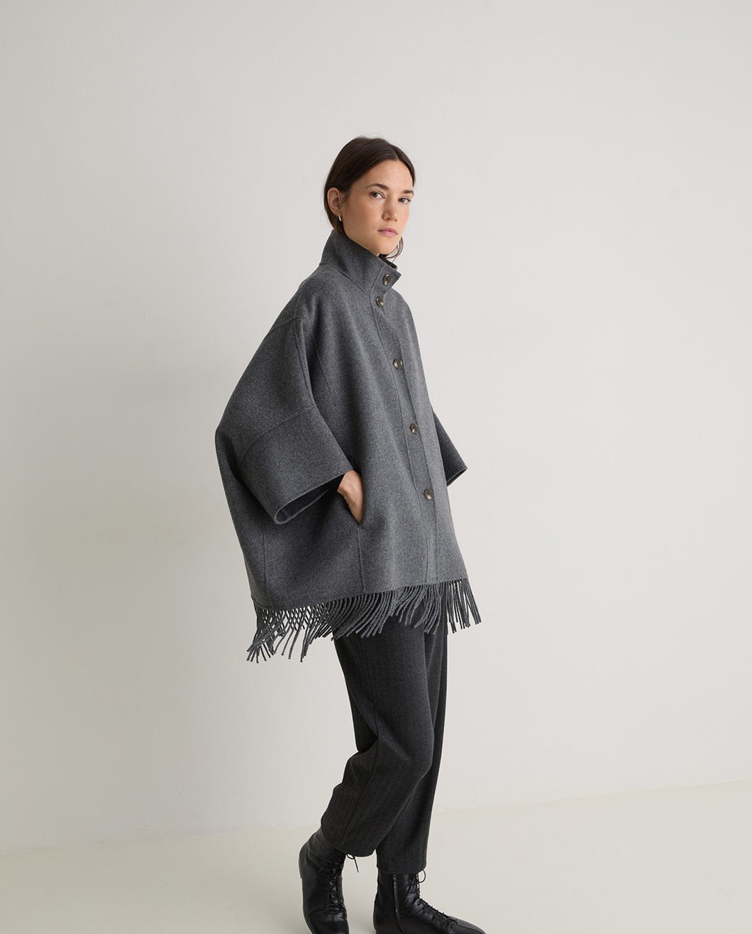 Handamde double-faced cape. Blend of wool and recycled fibres. High neck. 3/4 sleeves. Button front. Fringed ends. side pockets.